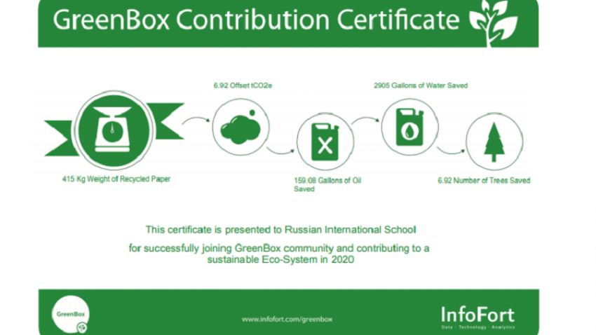 По результатам акции “GreenBox” за 2020 год школа получила экологический отчет от InfoFort о весе утилизированной бумаги, компенсированном объёме углерода, количестве сбереженных деревьев, литров воды и галлонов нефти. В наших силах позаботиться об окружающей среде!