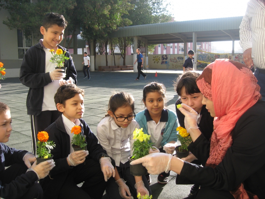 Ученики 4-х классов посадили цветы на территории школьного двора, как символ бережного отношения к окружающему миру.